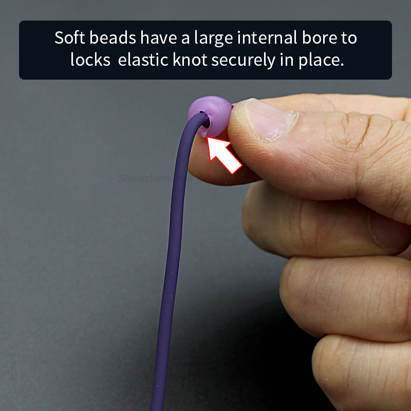 Soft beads have a large internal bore to locks elastic knot securely in place.